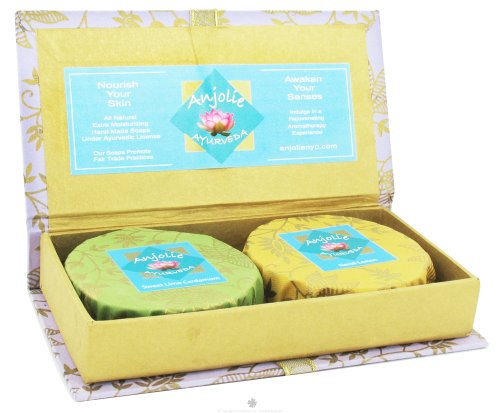 Anjolie Ayurveda Citrus Gift Box Sweet Lime Cardamom and Neroli Lemon Soap Anjolie Ayurveda Citrus Gift Box is a beautifully packaged set containing 1 piece of Sweet Lime Cardamom Soap and 1 piece of Neroli Lemon Soap.Anjolie Ayurveda Citrus Gift Box makes a great gift idea. Anjolie Ayurveda Citrus Gift Box consists of: Anjolie Ayurveda Sweet Lime Cardamom Soap Anjolie Ayurveda Sweet Lime Cardamom Soap combines the zest and spice of Lime and Cardamon as they compliment the subtle notes of exotic Lotus creating a fresh scent that will awaken the senses. Anjolie Ayurveda Sweet Lime Cardamom Soap will easily help you to warm your spirits. With Anjolie Ayurveda Sweet Lime Cardamom Soap, you will get lost balmy, aromatic waves of a sweet, tropical citrus grove. Anjolie Ayurveda Sweet Lime Cardamom Soap is 100% Vegan, is gluten-free, is never tested on animals and is paraben free. Anjolie Ayurveda Sweet Lime Cardamom Soap promotes Fair Trade Practices and Sustainable Farming in India. Anjolie Ayurveda Neroli Lemon Soap Anjolie Ayurveda Neroli Lemon Soap combines the uplifiting and refreshing scent of Lemon that balances with Neroli, which adds a sweet and spicy aroma. Anjolie Ayurveda Neroli Lemon Soap gets its name from the Princess of Neroli who used bitter orange blossoms to perfume her royal bath. Anjolie Ayurveda Neroli Lemon Soap helps with exhaustion and soothes the nervous system, calming the mind from anxiety. Anjolie Ayurveda Neroli Lemon Soap also helps to increase circulation in the body. Anjolie Ayurveda Neroli Lemon Soap is 100% vegan, is gltuen-free, is never never tested on animals and is free of parabens. Anjolie Ayurveda Neroli Lemon Soap promotes Fair Trade Practices and Sustainable Farming in India.About Anjolie Ayurveda Products Anjolie Products and Their High FIVE Philosophy Anjolie is proud of their ingredients! With their skincare products, you'll use only 5 highly moisturizing ingredients on your skin, plus their nourishing essential oils.