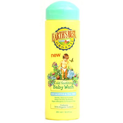 Earth's Best Organic Cold Soothing Baby Wash is an ever-so-gentle, soothing formula for when baby is stuffy and congested. A warm bath combined with the aromatic blend of natural eucalyptus, tea tree and menthol helps baby breathe easier and soothes achy-ness and crankiness. This hypo-allergenic, non-irritating wash also contains aloe vera, echinacea and beta-glucan so baby's skin is soft and clean. It's the perfect formula to help you and your baby rest easier. Contains 70% Organic Content Hypo-allergenic No Sodium Lauryl/Laureth Sulfate or Sodium Methyl Sulfate No Mineral Oil, Petrolatum or Waxes No Parabens or Harsh Preservatives No Synthetic Fragrances, Colors or Phthalates 100% Vegetarian, No Animal Testing Free Of Sodium lauryl/laureth sulfate, sodium methyl sulfate, mineral oil, petrolatum, waxes, parabens, harsh preservatives, synthetic fragrances, colors, phthalates and animal testing. Disclaimer These statements have not been evaluated by the FDA. These products are not intended to diagnose, treat, cure, or prevent any disease. . Earth's Best Organic Cold Soothing Baby Wash - Eucalyptus and Tea Tree Directions .Wet baby's body with warm water. Pour a moderate amount into hand or wash cloth and gently wash baby's skin. Or pour 1 ounce directly into water when filling the bathtub. Rinse thoroughly. . Ingredients: Aloe barbadensis leaf juice*, aqua (water), decyl glucoside, sodium coco-sulfate, sodium chloride, glycerin, lauryl lactyl lactate, avena sativa (oat) bran*, beta-glucan*, echinacea angustifolia extract*, eucalyptus globulus leaf oil*, melaleuca alternifolia (tea tree) leaf oil*, citric acid, camphor, menthol*, sodium sulfate, alcohol*, potassium sorbate, sodium benzoate. *Cert